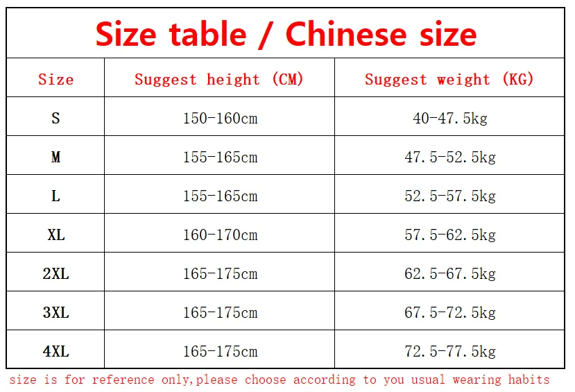 Suggested size and weight: S:40-47.5KG,M:47.5-52.5KG,L:52.5-57.5KG,XL:57.5-62.5KG,2XL:62.5-67.5KG,3XL:67.5-72.5KG